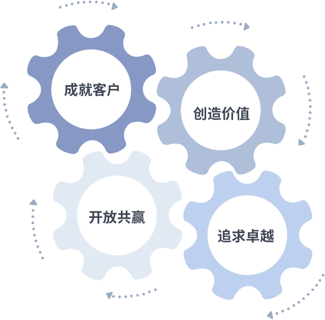 成就客户是一切决策的出发点,,创造价值是衡量所有工作的标准,,,追求卓越是我们做事做人的态度,,开放共赢是我们的格局也是最终的结果。。价值观的齿轮环环相扣,,,推动着组织里的每个人不断向前。。。。