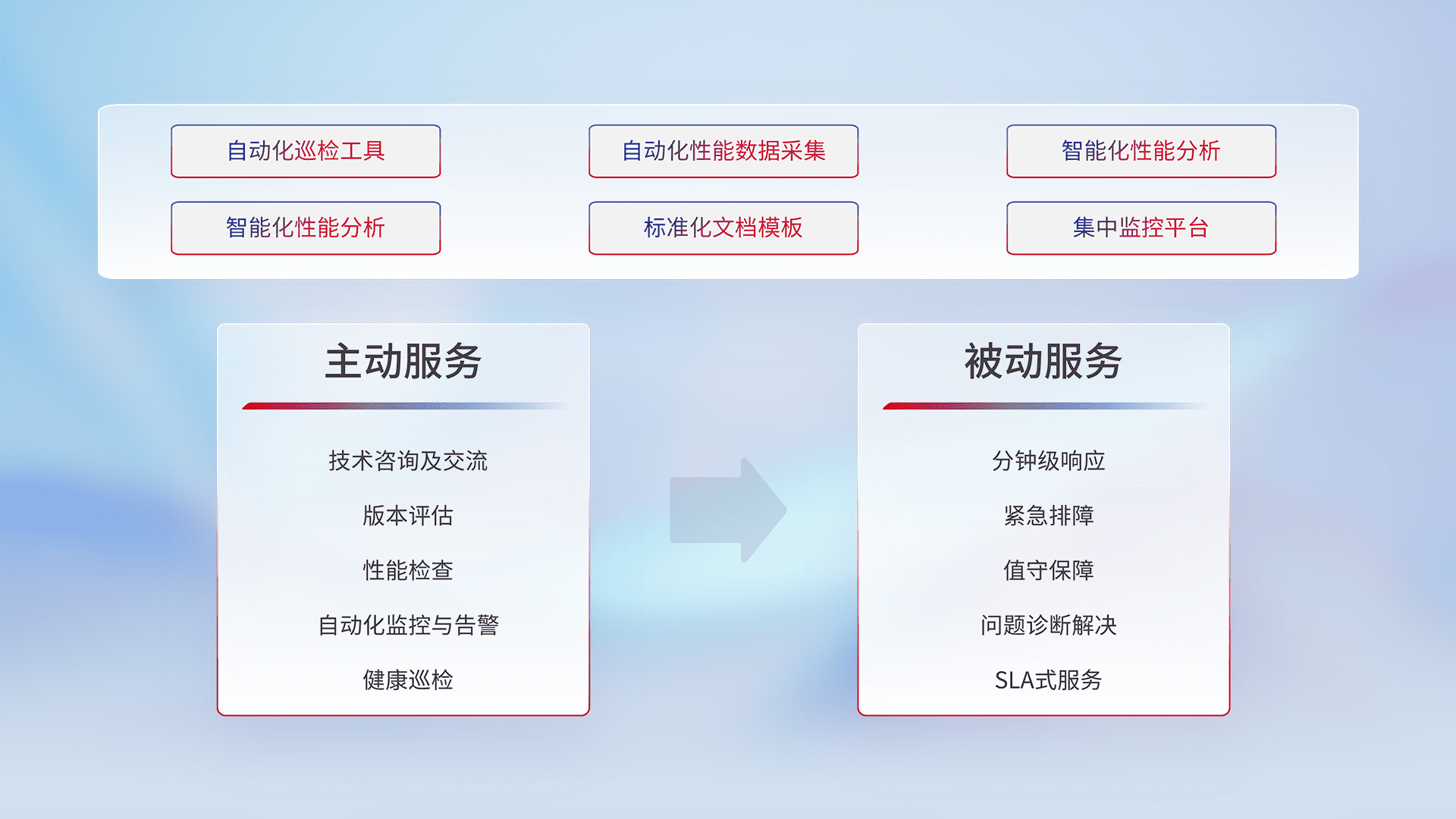 智能化工具和标准化文档,,,保障服务质量,,,提供主动服务(包含技术咨询、、、版本评估、、性能检查、、、、自动化监控与告警、、、健康巡检)和被动服务包含(分钟级响应、、、、紧急排障、、值守保障、、问题诊断解决、、、SLA服务)。。